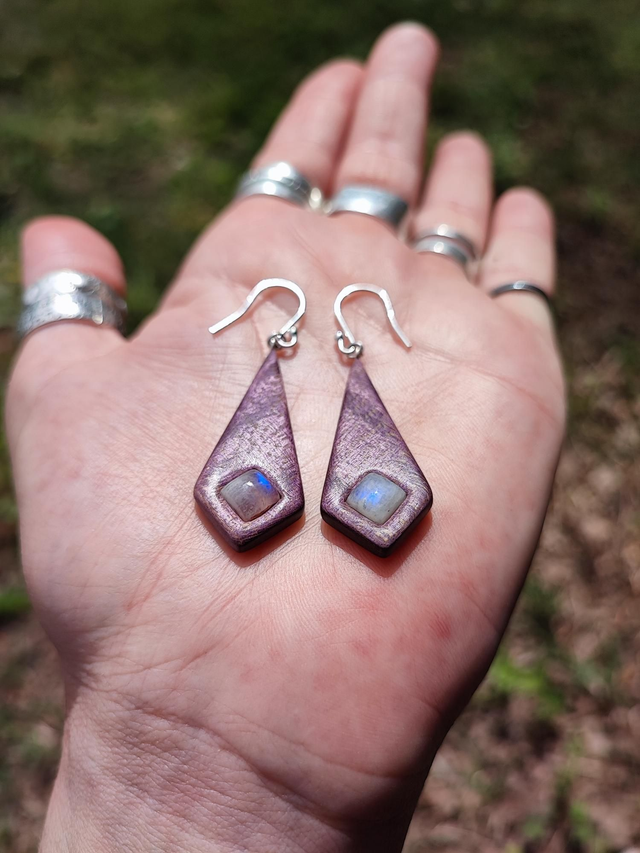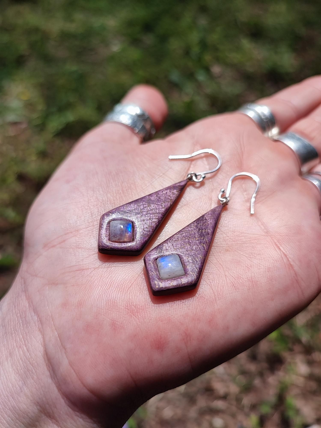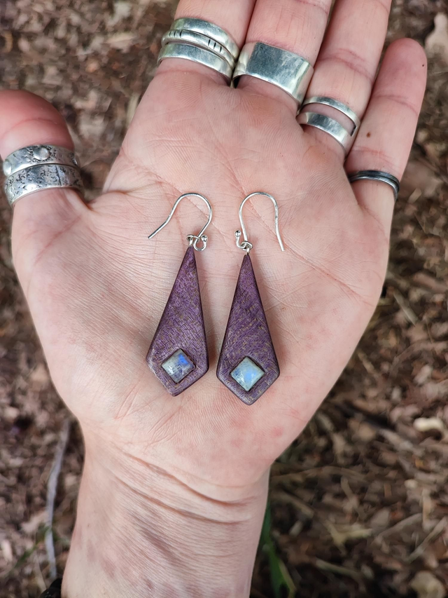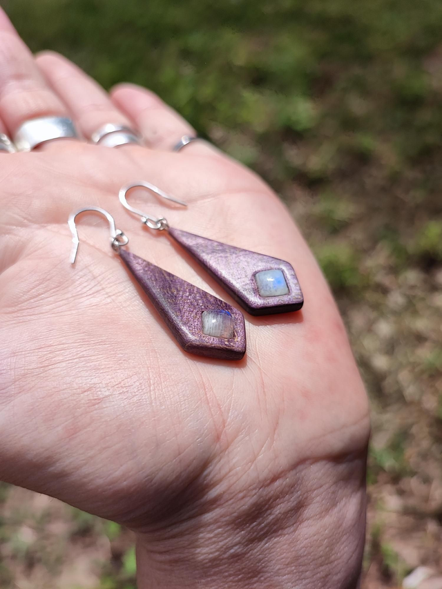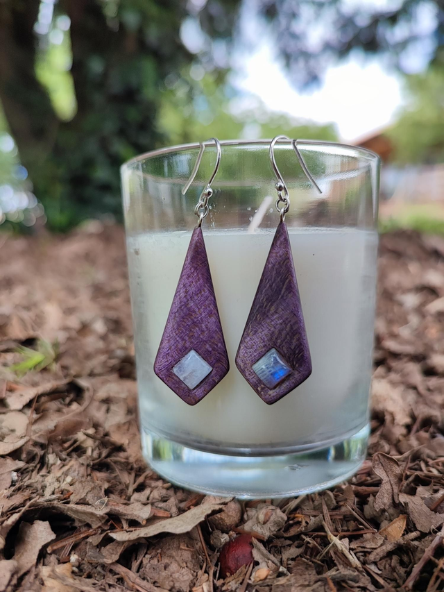 Boucles d'Oreilles en Bois d'Érable Sycomore Ondé stabilisé violet, Péristérite et Argent