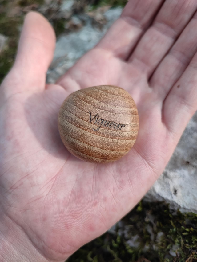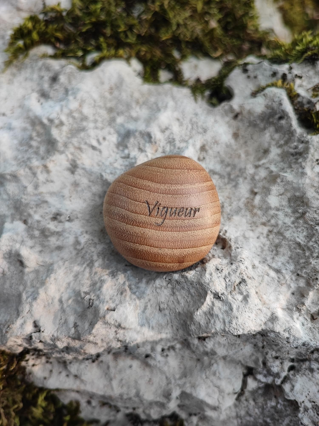 Gravure au Laser "Vigueur" (en rapport avec les vertus du bois utilisé, voir ci après).