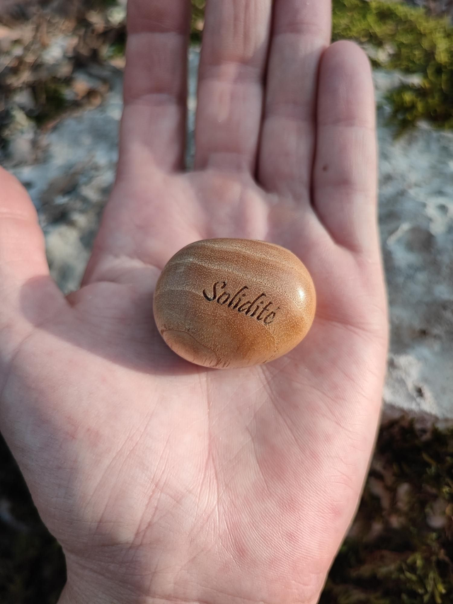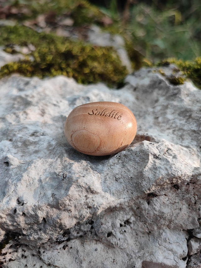 Gravure au Laser "Solidité" (en rapport avec les vertus du bois utilisé, voir ci après).