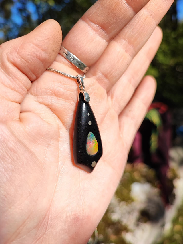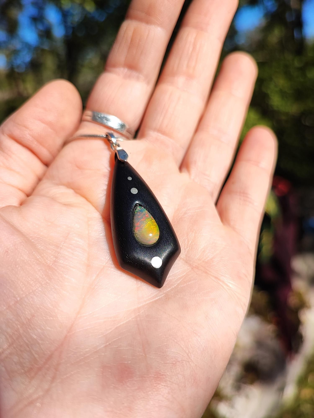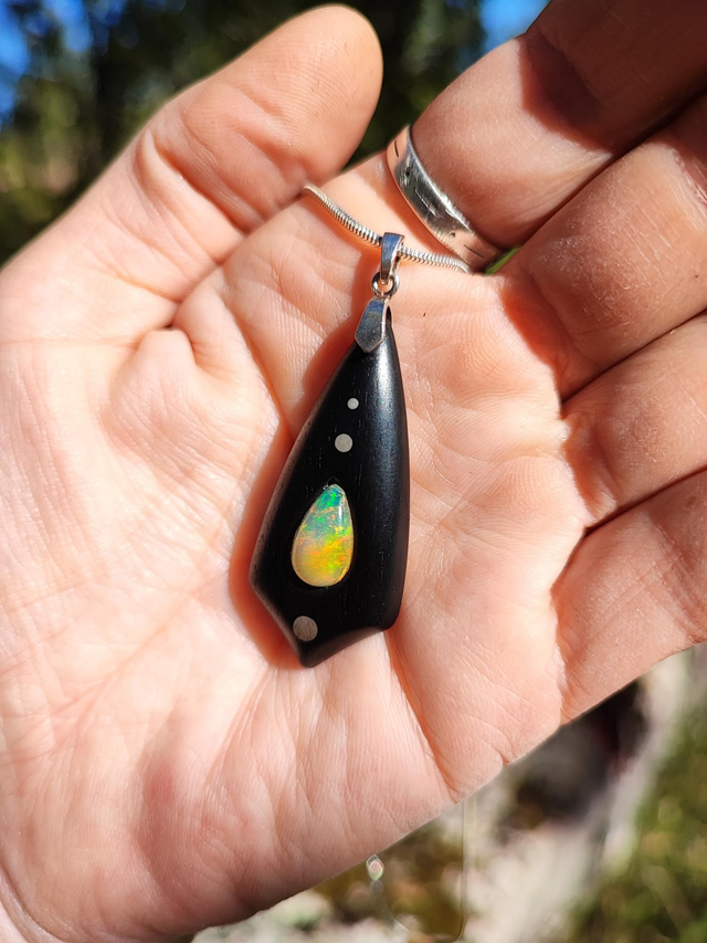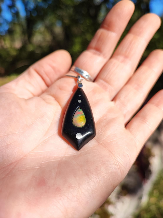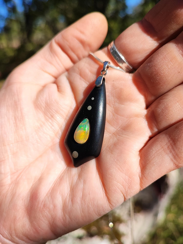 Pendentif en Bois d'Ébène du Gabon, Opale Welo et Argent