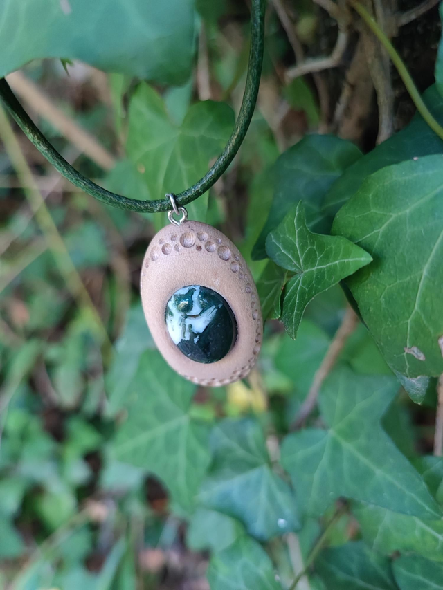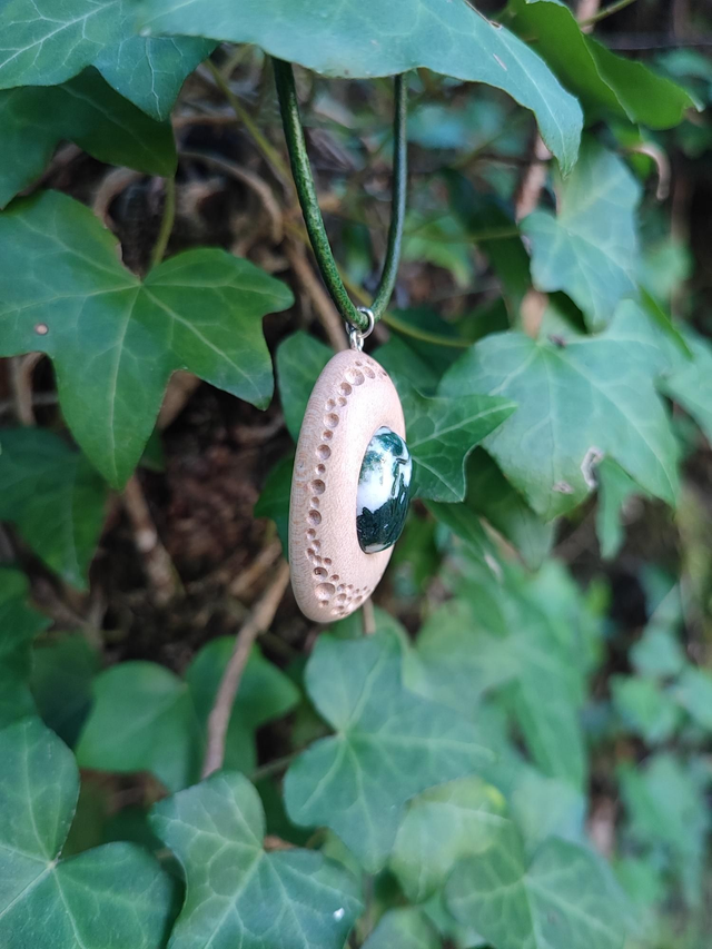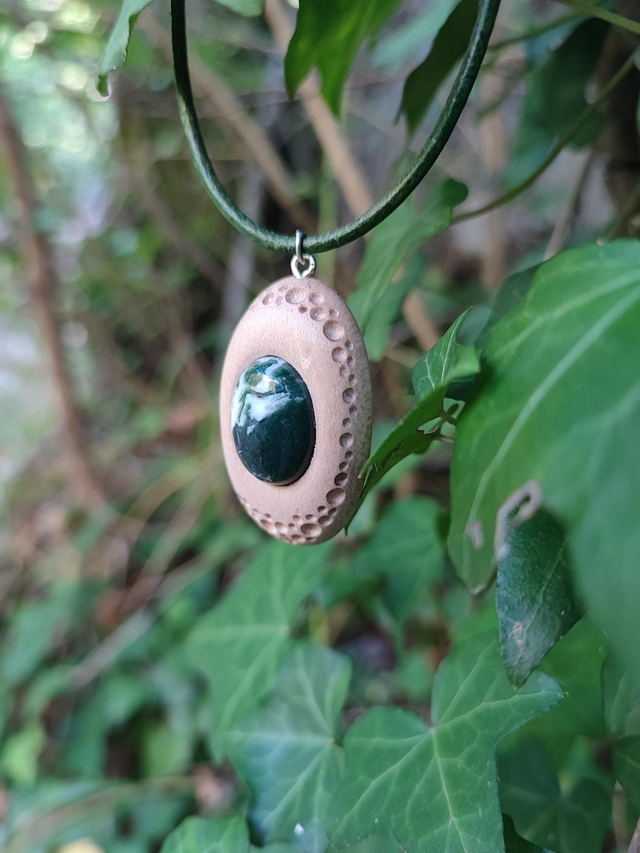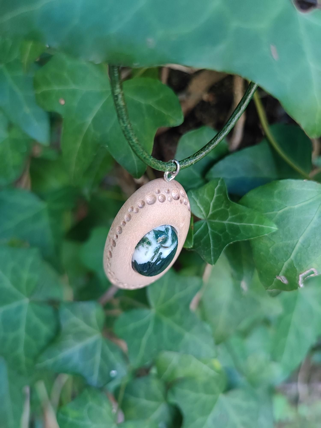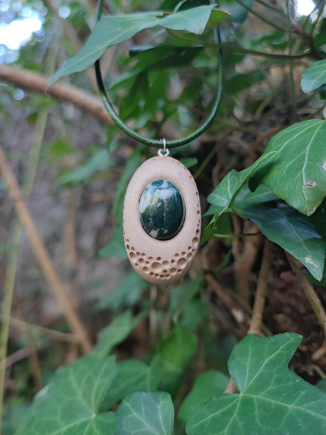 Pendentif en Bois d'Érable Sycomore, Agate Mousse et Cordon Cuir