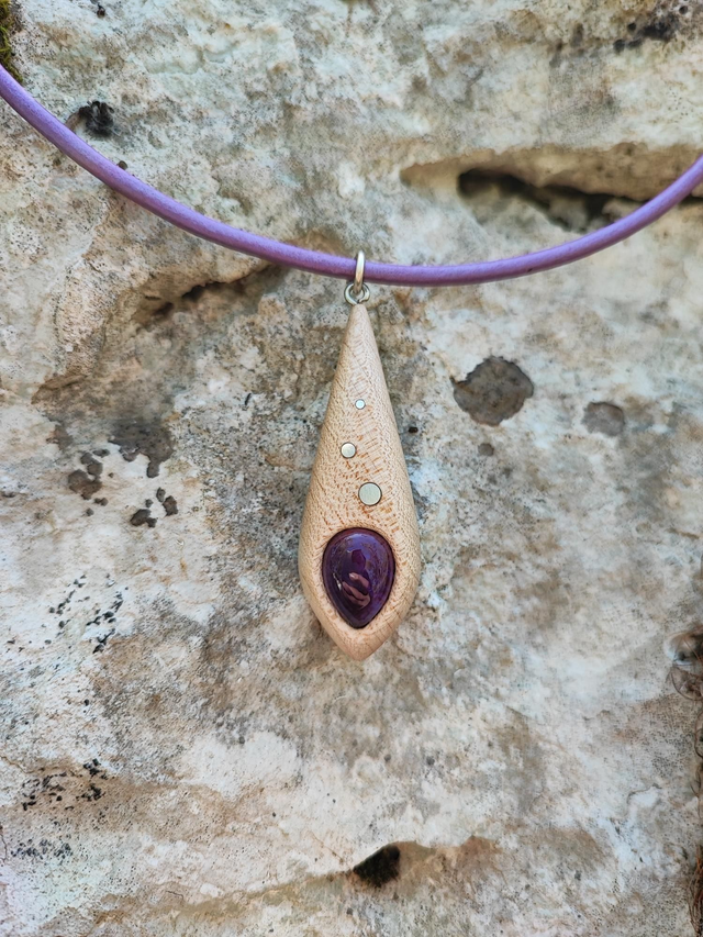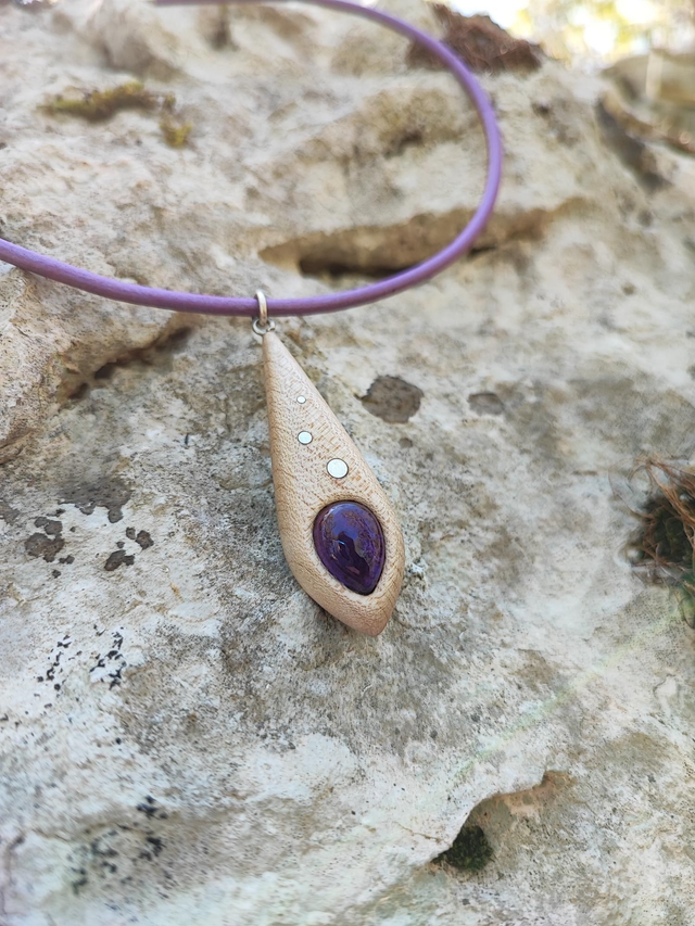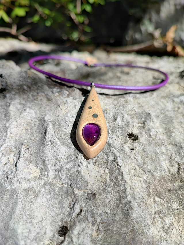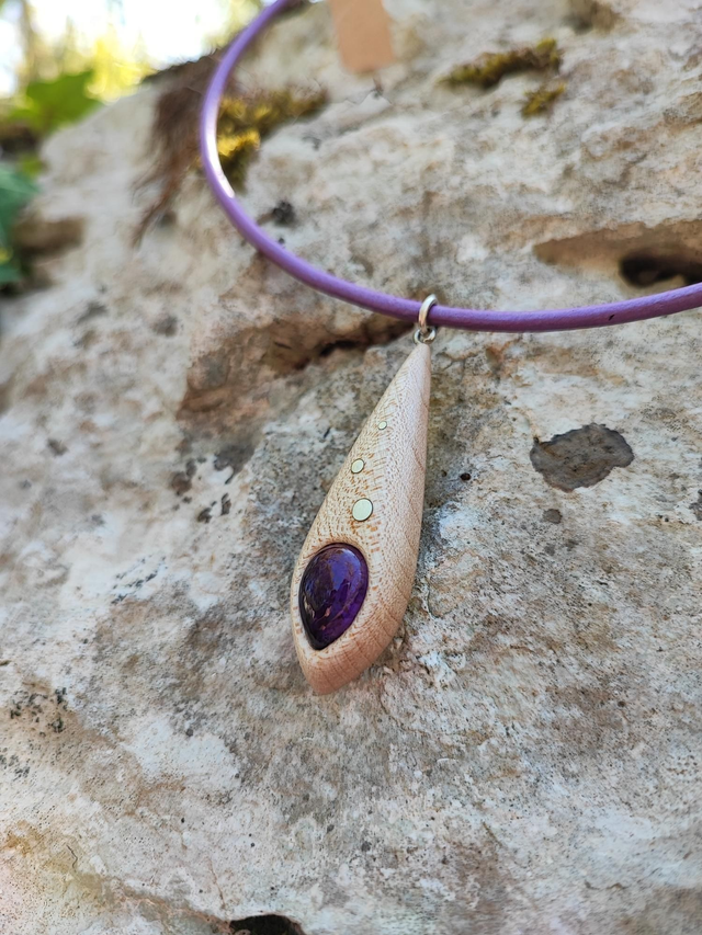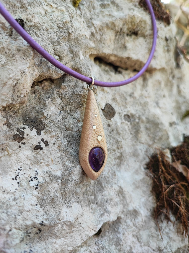 Pendentif en Bois d'Érable Sycomore, Améthyste et Cordon Cuir