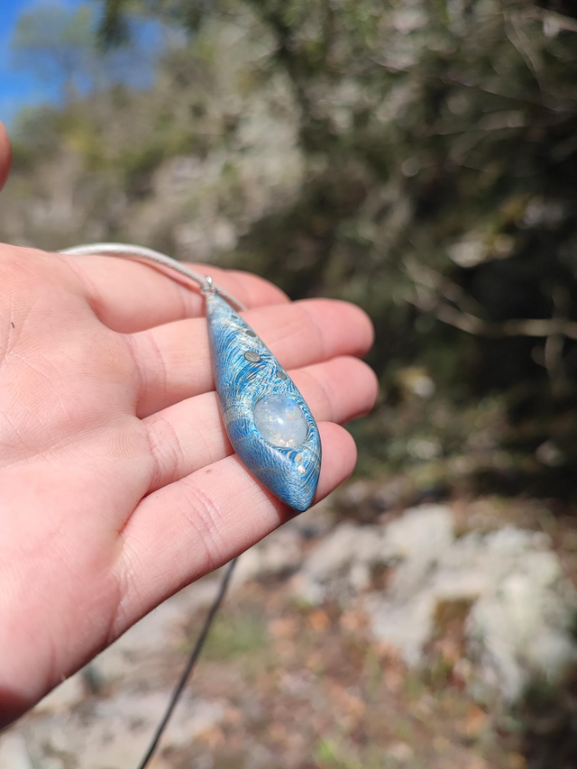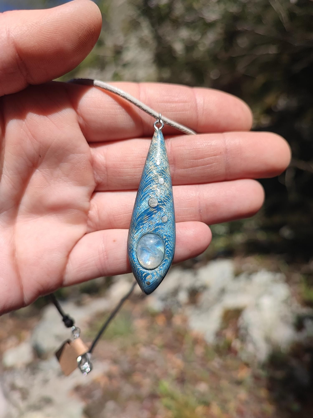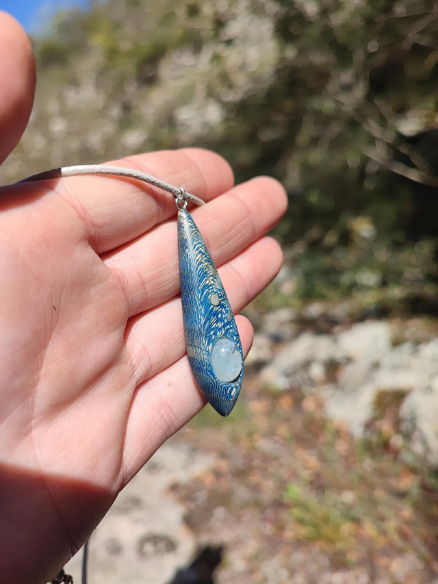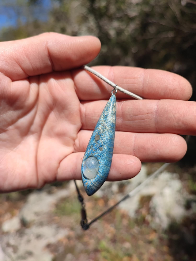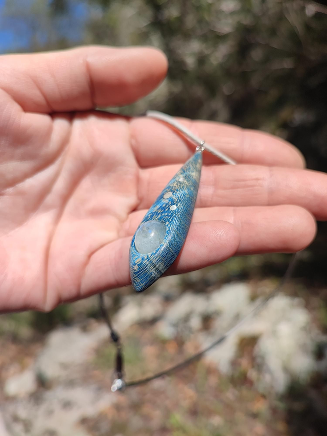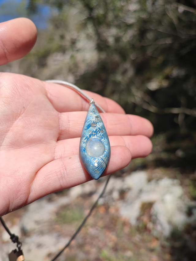 Pendentif en Bois d'Érable Sycomore ondé stabilisé bleu, Argent, Péristérite et Cordon Cuir