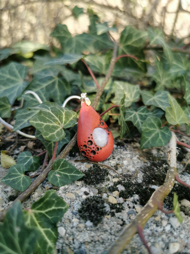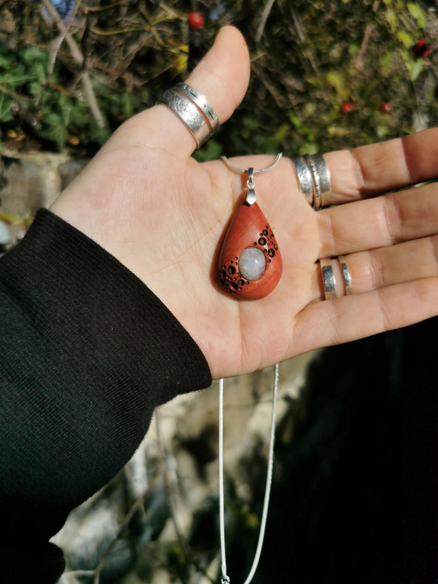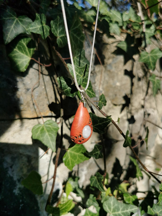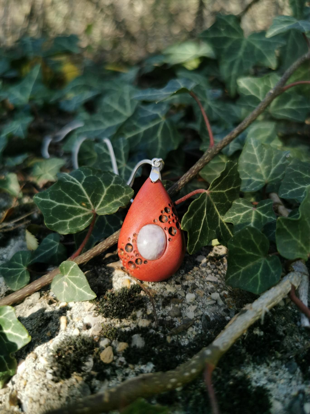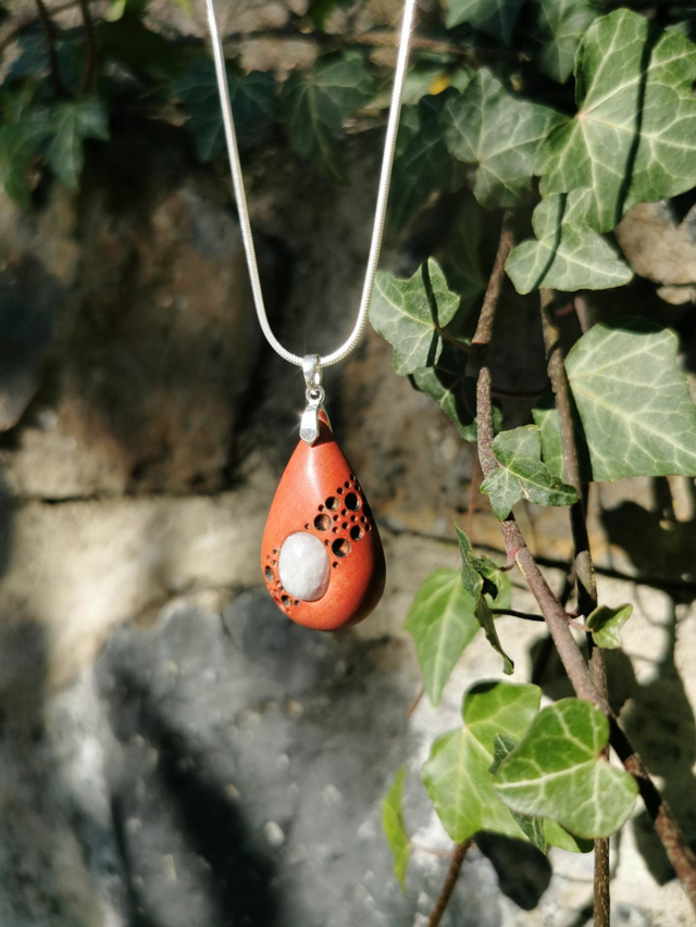 Pendentif en Bois d'Ivoire Rose, Péristerite et Argent