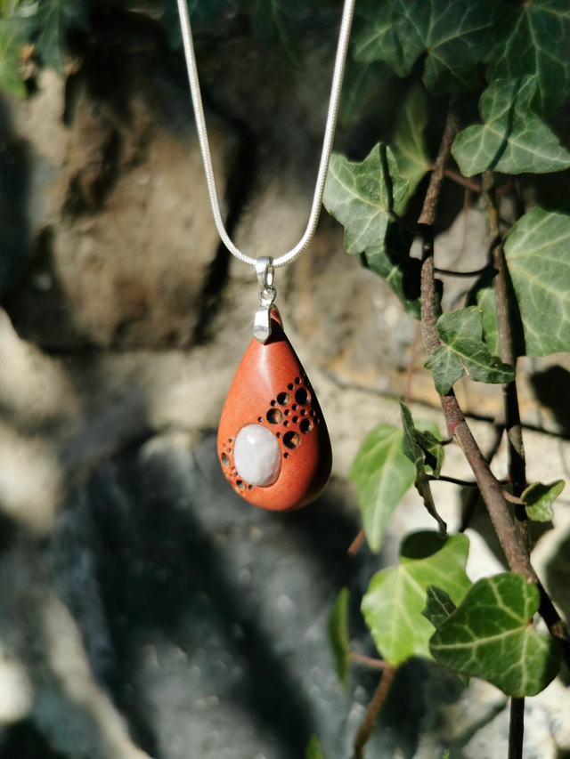 Voici la description pour un pendentif en bois d'Ivoire Rose et Péristérite :