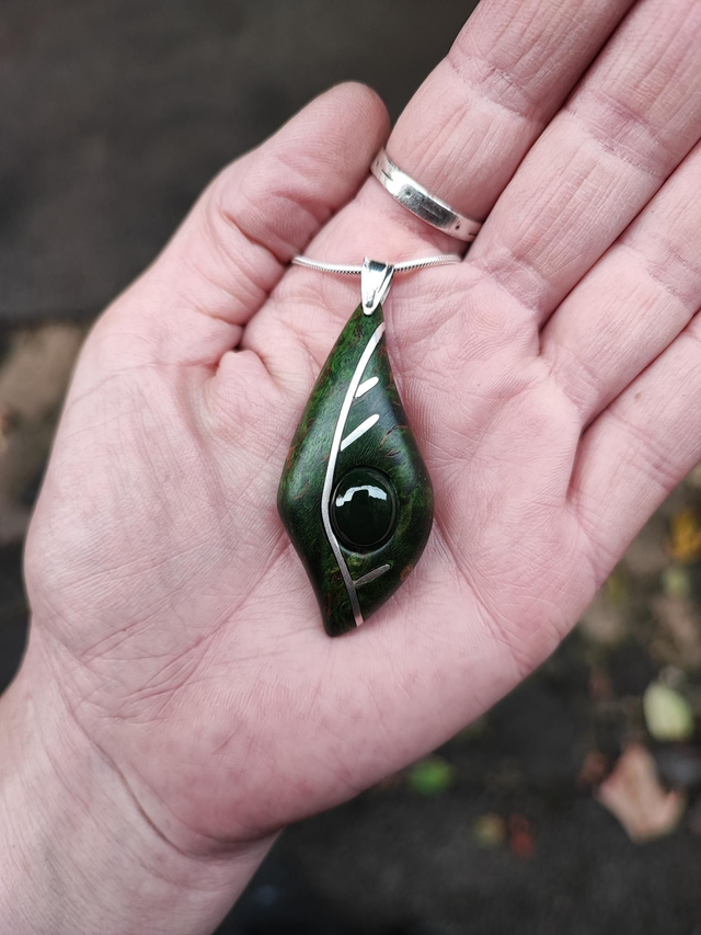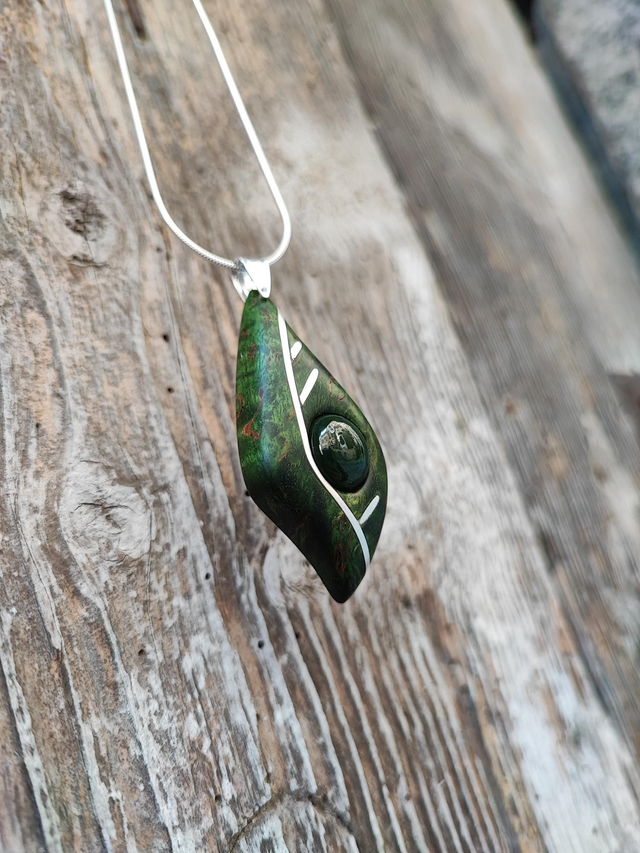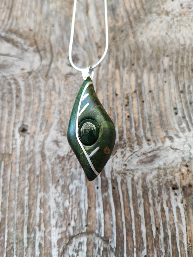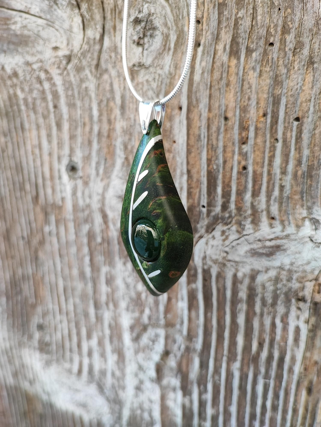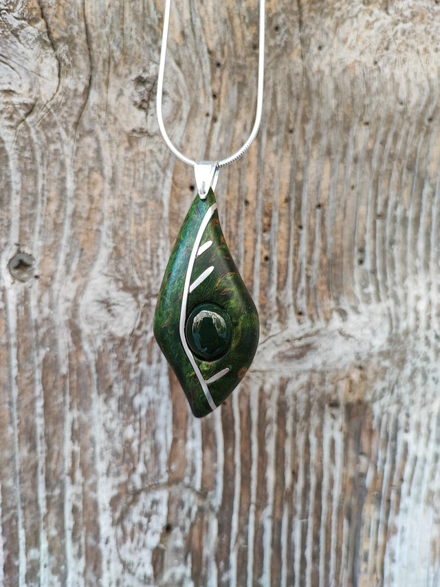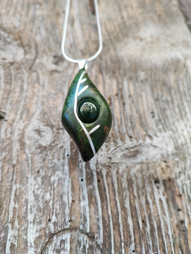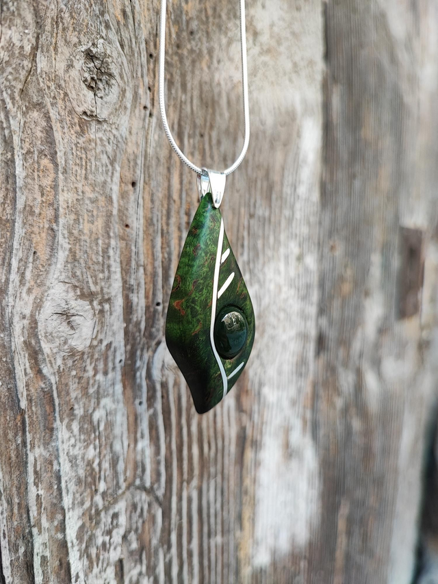 Pendentif en Bois de Bouleau de Carélie stabilisé vert, Jade Néphrite et Argent