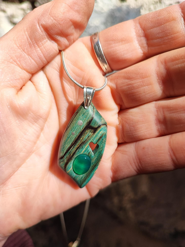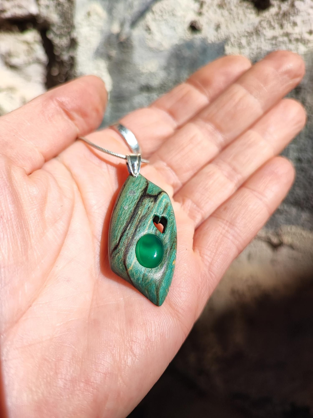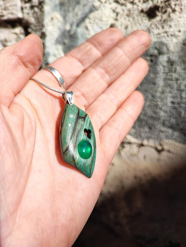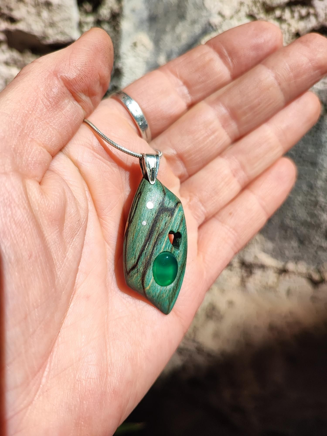 Pendentif en Bois de Hêtre Échauffé stabilisé vert, Agate et Argent
