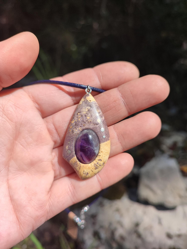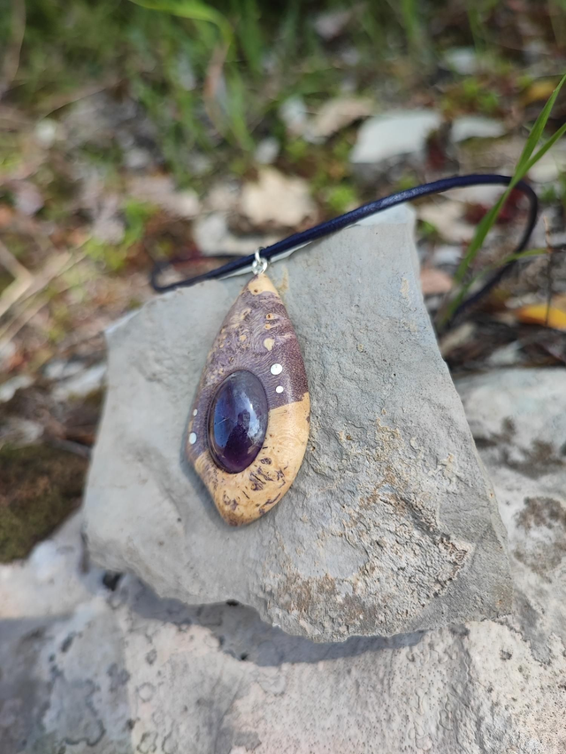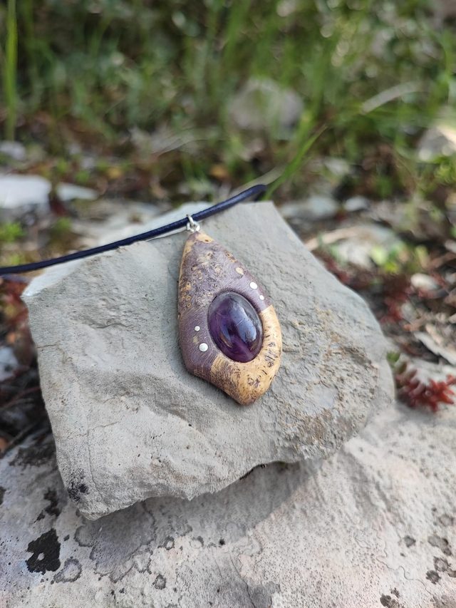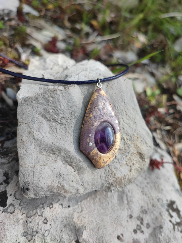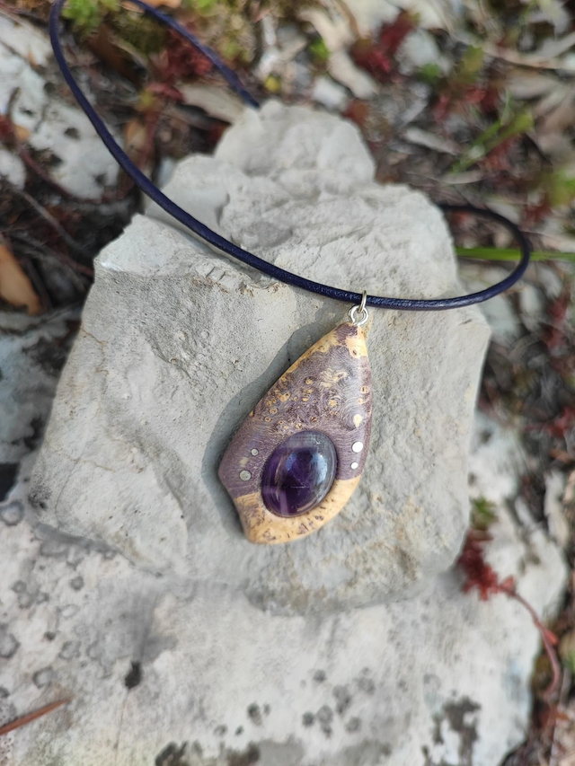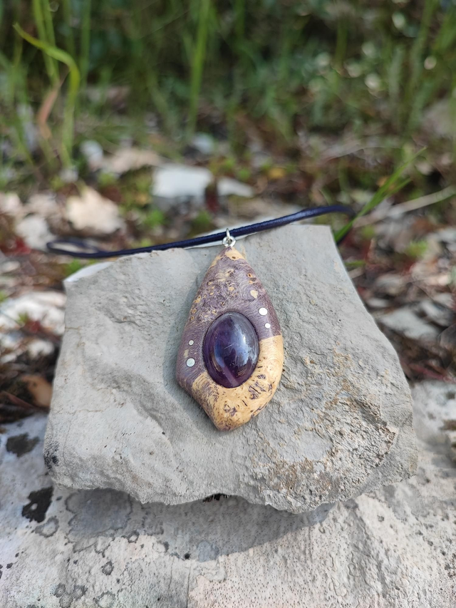 Pendentif en Bois de Loupe d'Érable stabilisé violet, Améthyste, Argent et Cordon Cuir