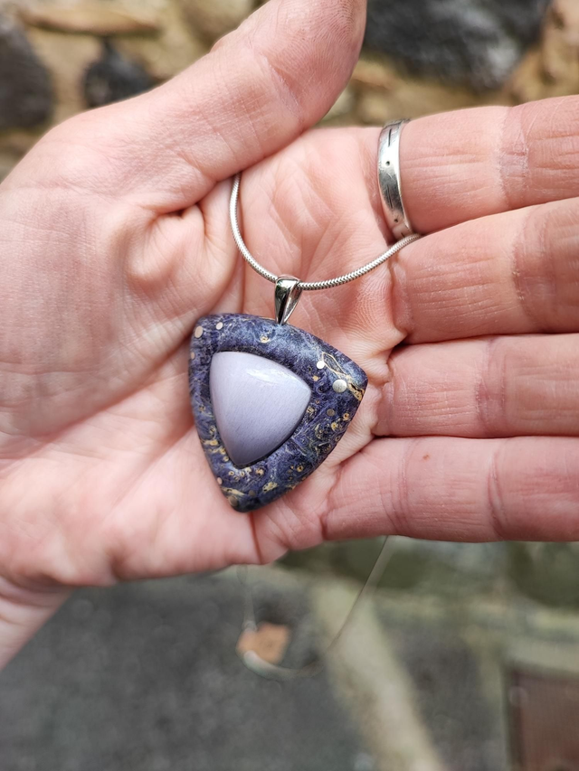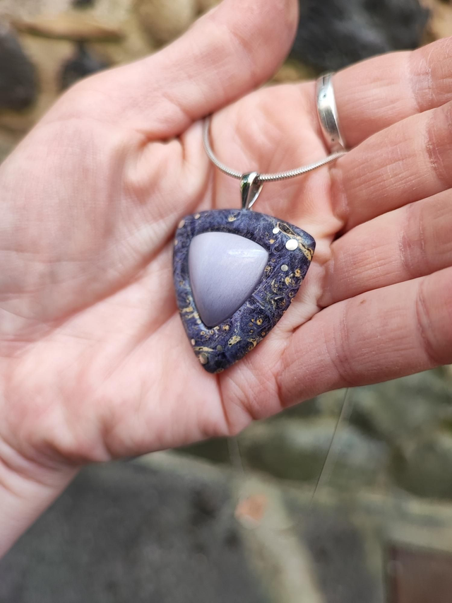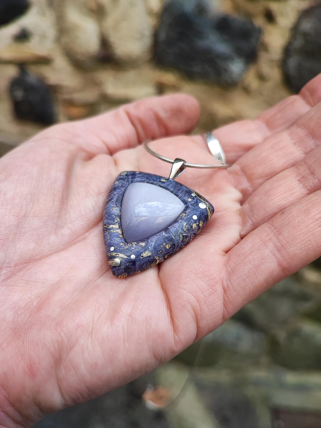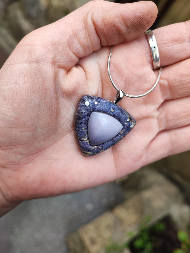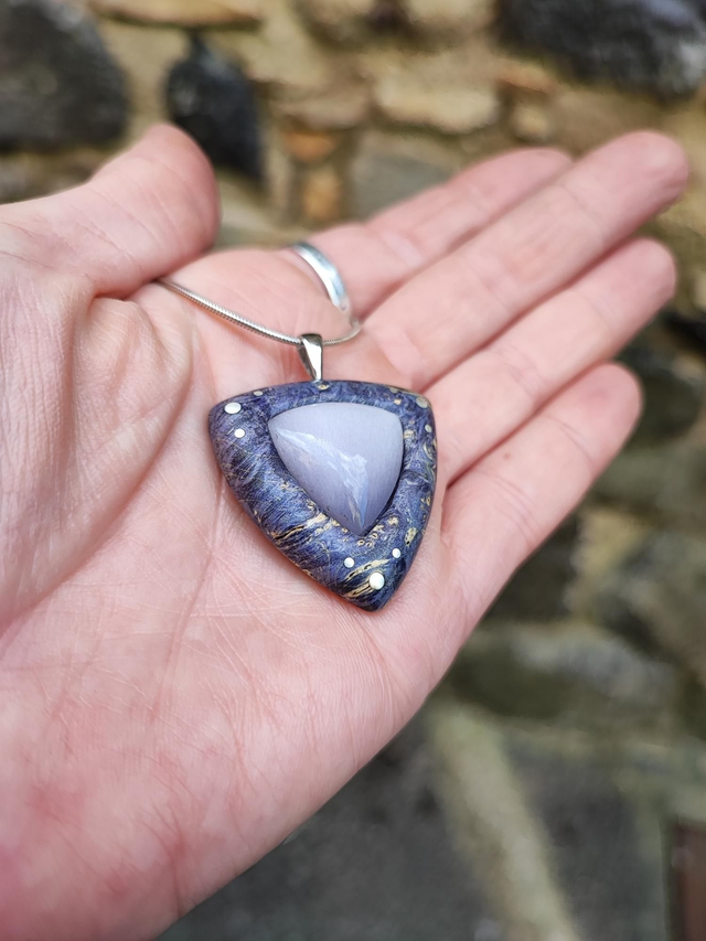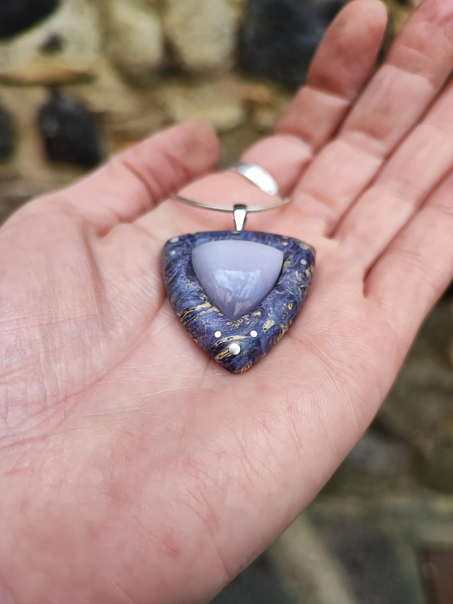 Pendentif en Bois de Loupe d'Érable stabilisé violet, Yttrium fluorite et Argent