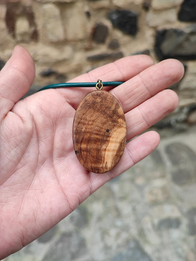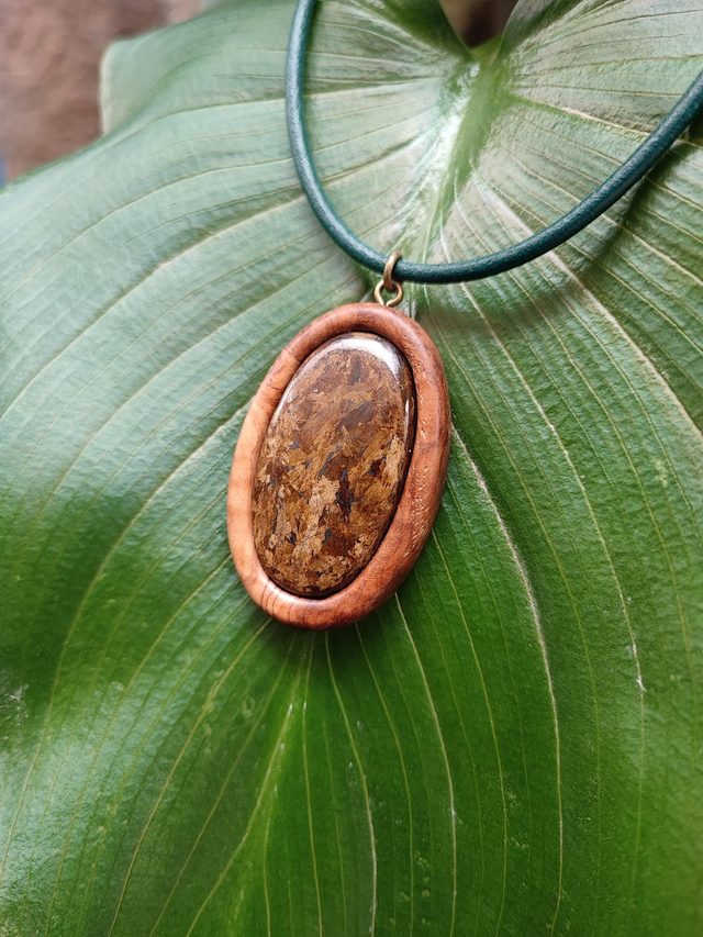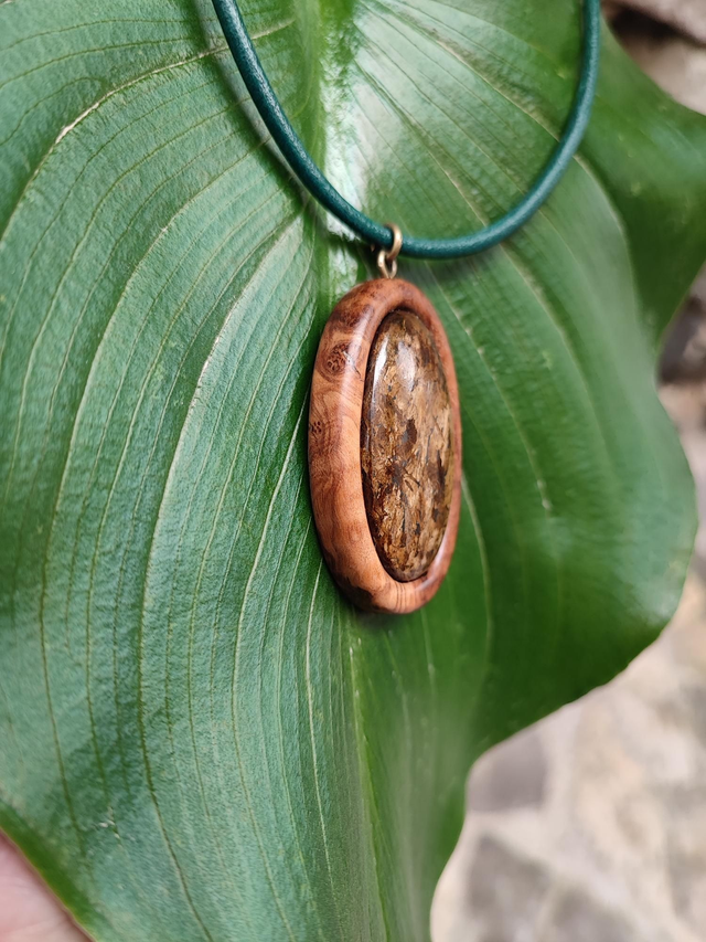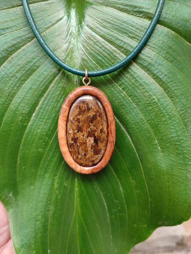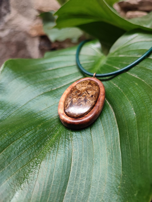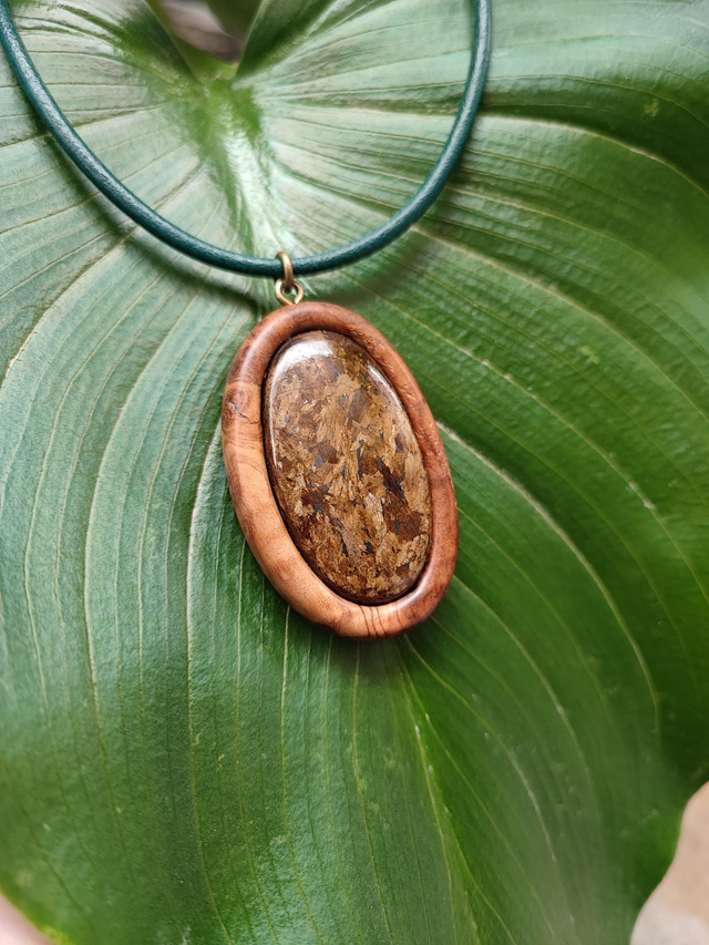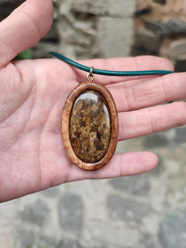 Pendentif en Bois de Loupe de Châtaignier, Bronzite et Cordon Cuir
