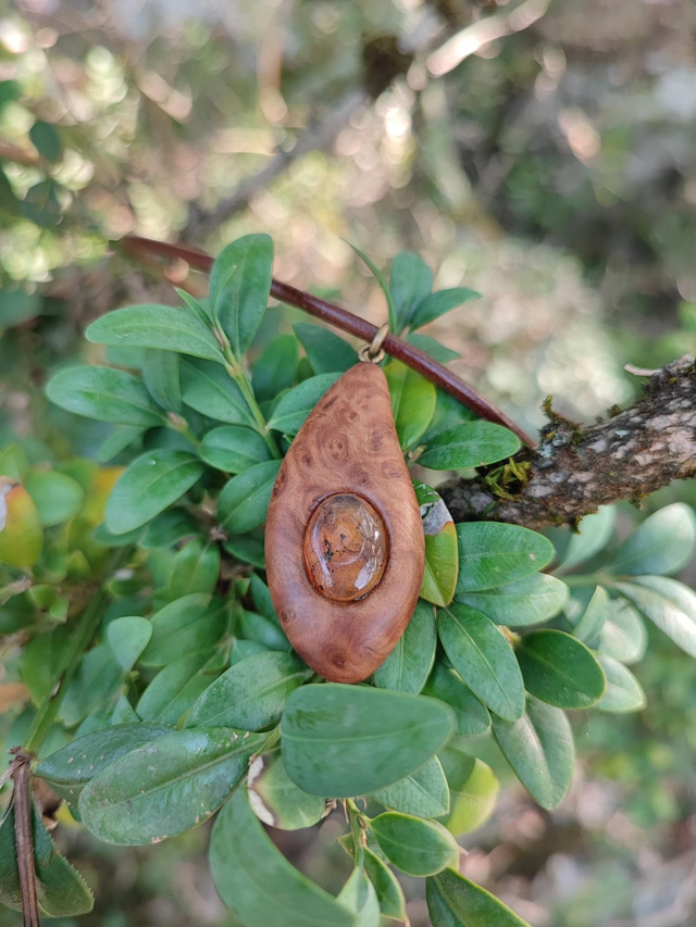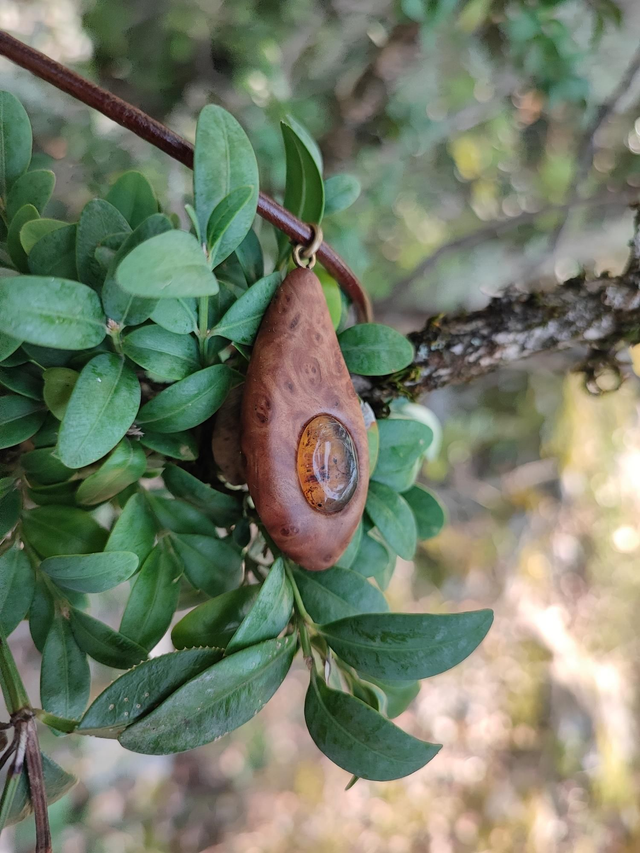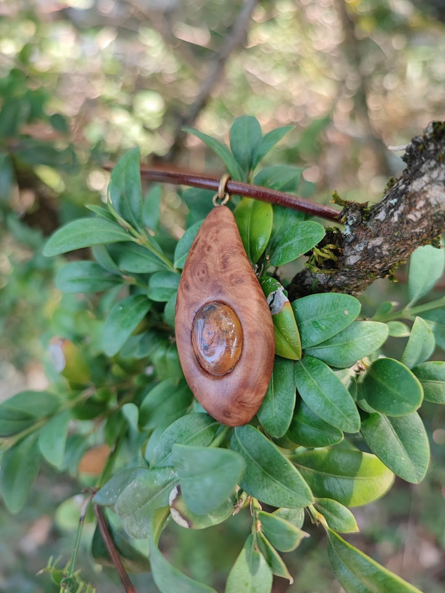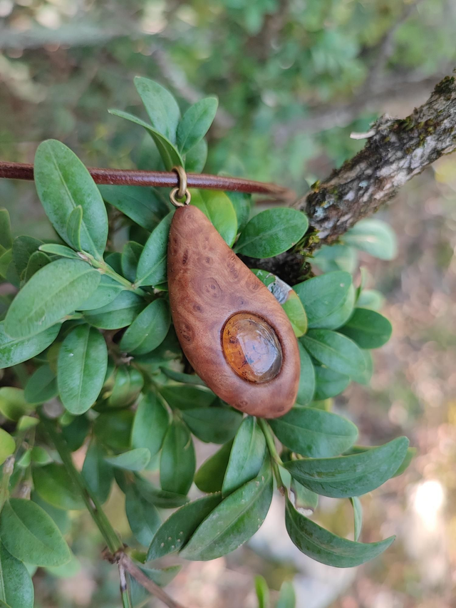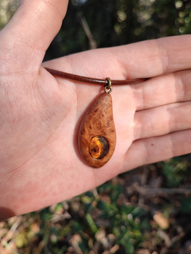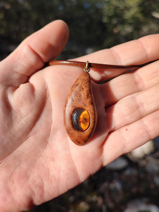 Pendentif en Bois de Loupe de Goldfield, Ambre du Mexique et Cordon Cuir