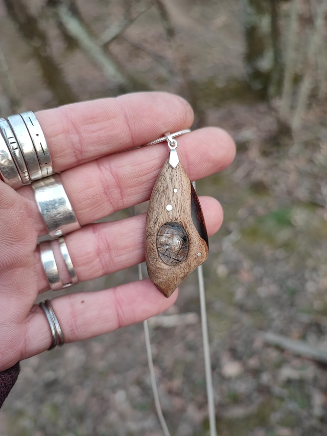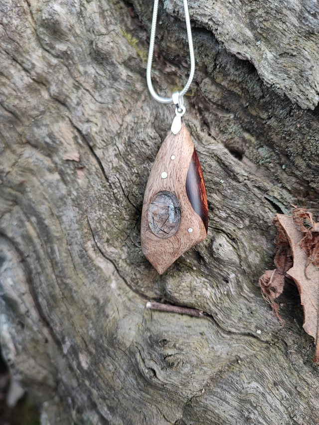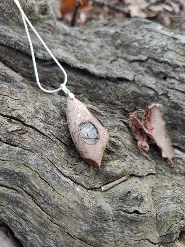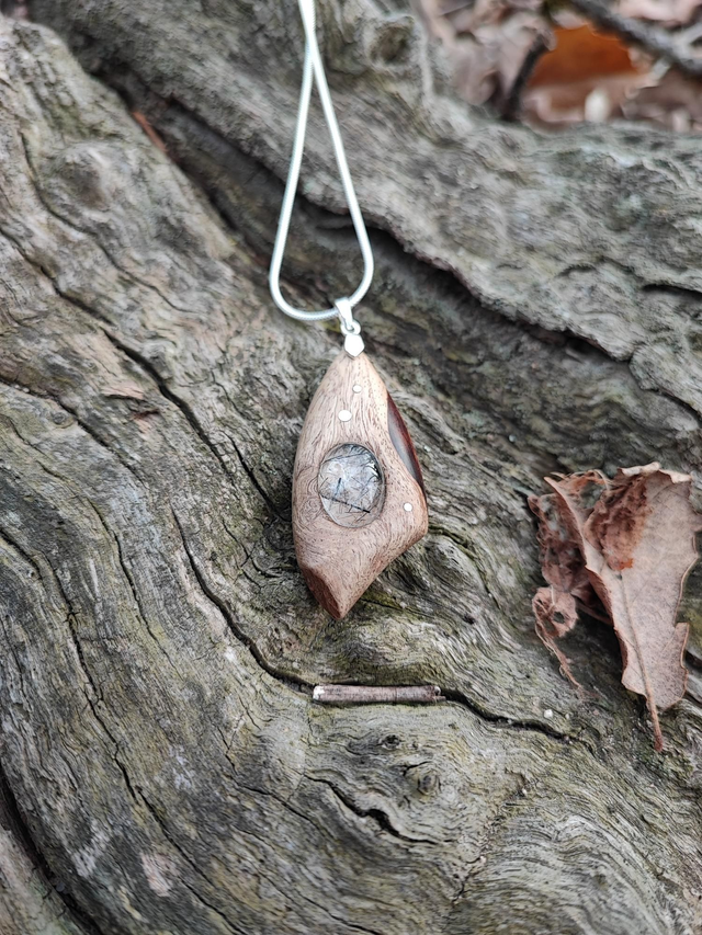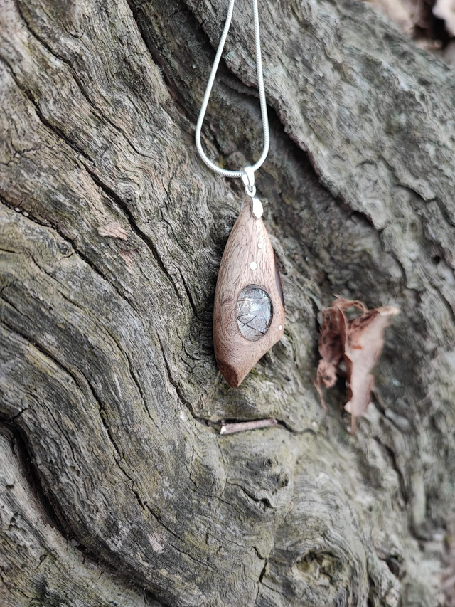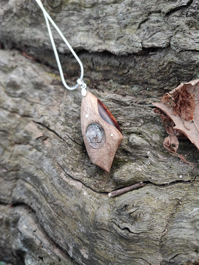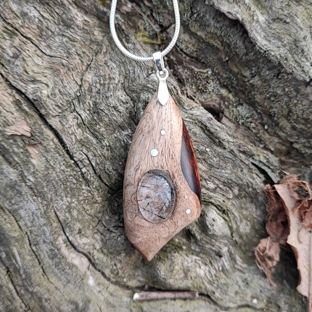 Pendentif en Bois de Loupe de Palissandre du Honduras, Quartz à inclusions de Tourmaline et Argent