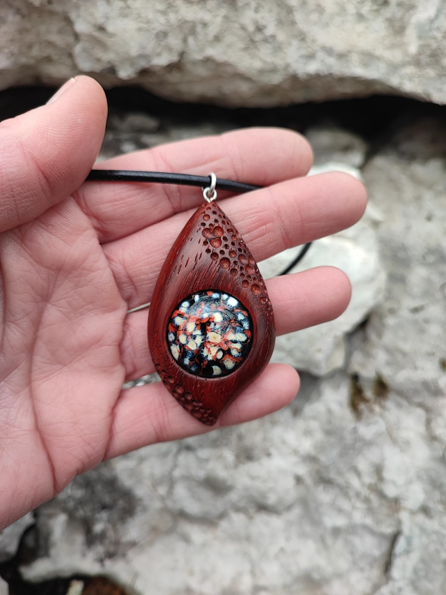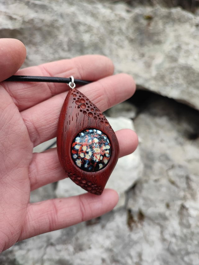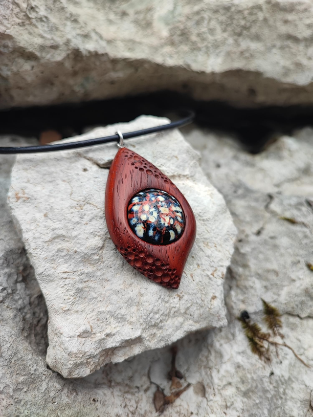 Ce pendentif en Bois de Padouk marie la chaleur profonde de cette essence précieuse, réputée pour ses vertus d’équilibre et de protection, à une pièce centrale en verre filé au chalumeau, réalisée par une artisane passionnée. Le bois de Padouk avec ses nuances élégantes, incarne l'harmonie et la force, tandis que le verre artisanal apporte une touche de lumière et de raffinement. Chaque pendentif est une pièce unique, fruit d'un savoir-faire méticuleux, qui allie nature et créativité.