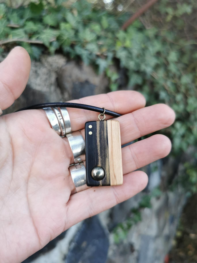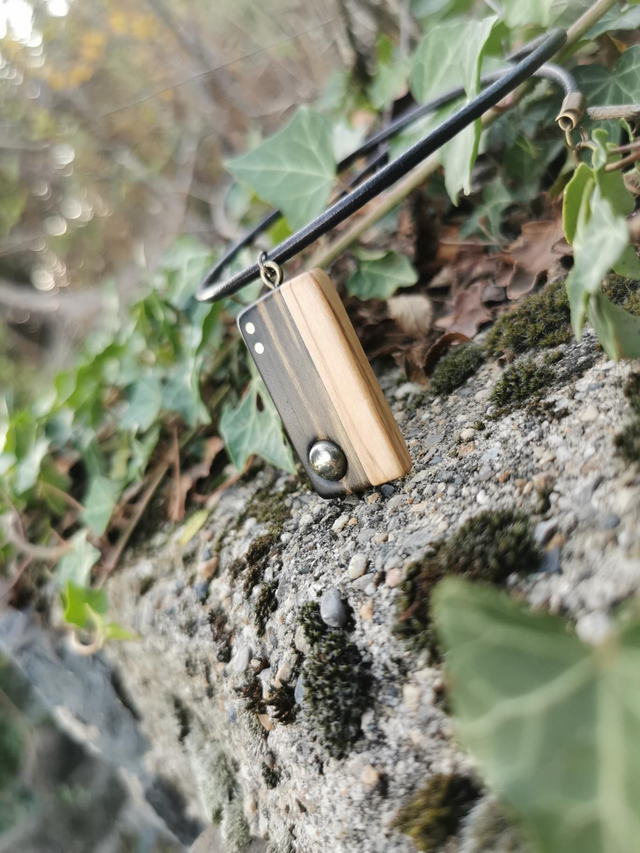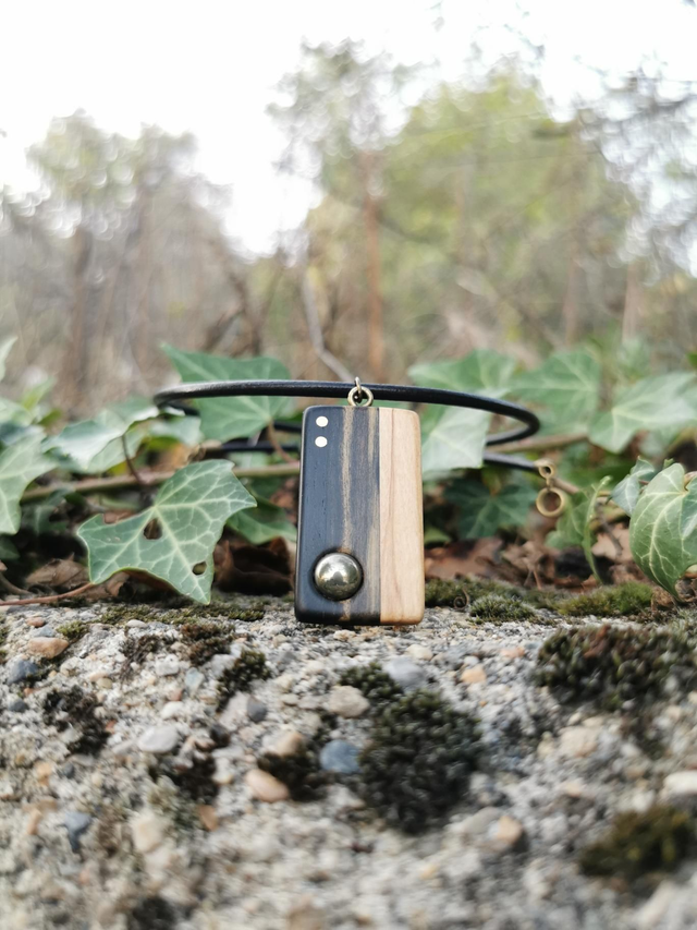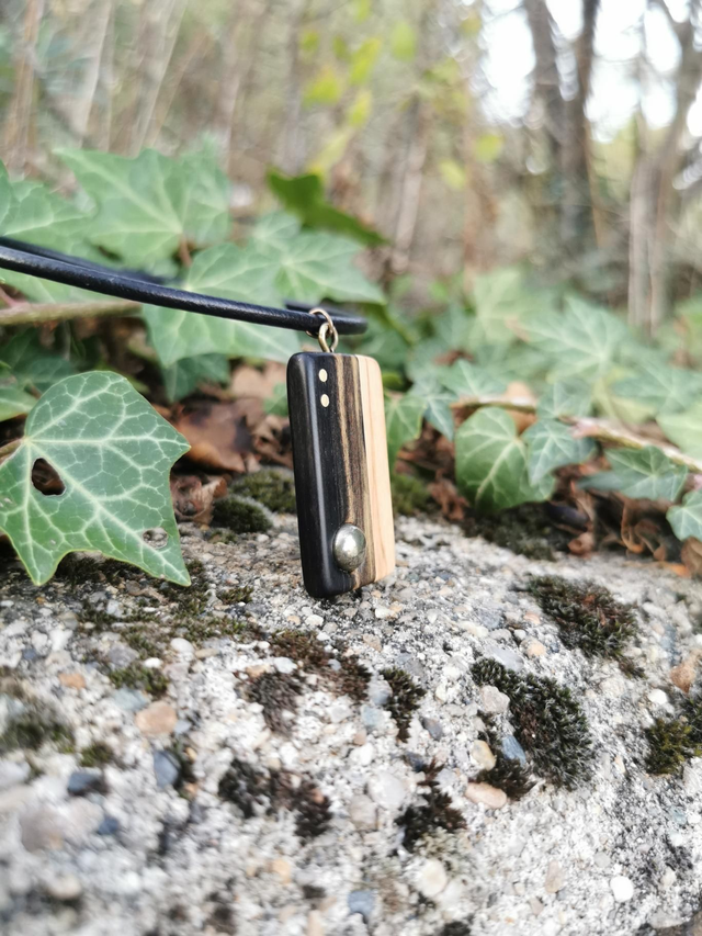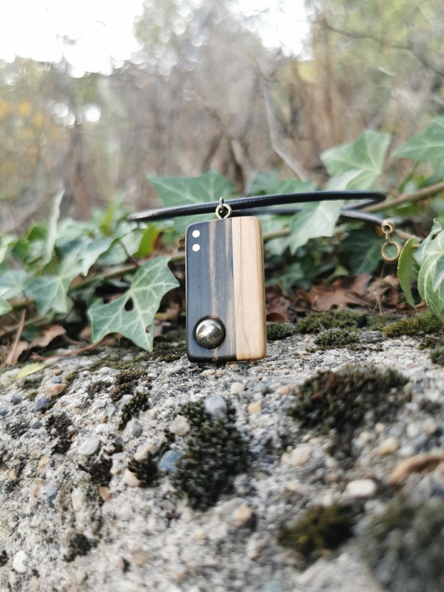 Pendentif Rectangle en Bois d'Ébène du Gabon, Ébène Royal, Olivier, Laiton, Pyrite et Cordon Cuir