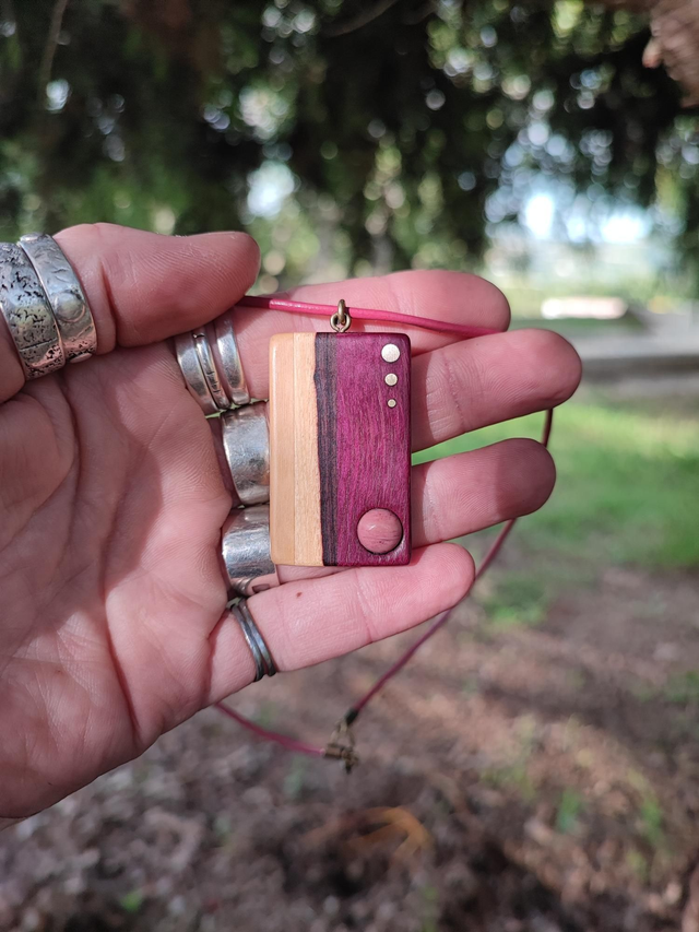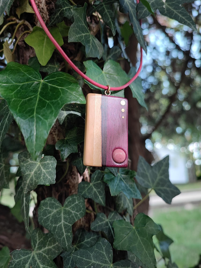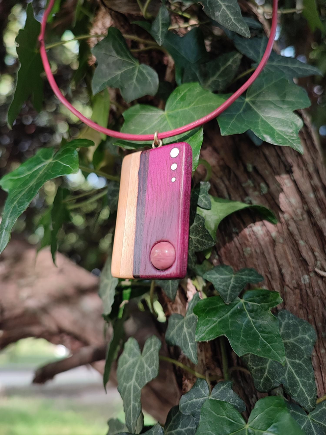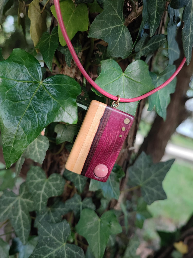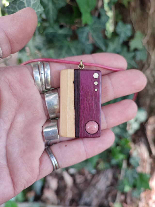 Pendentif Rectangle en Bois de Buis, Bois de Violette, Amarante, Laiton, Rhodonite et Cordon Cuir