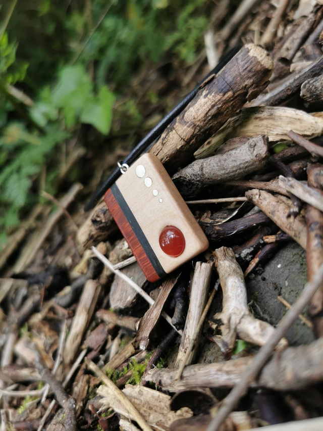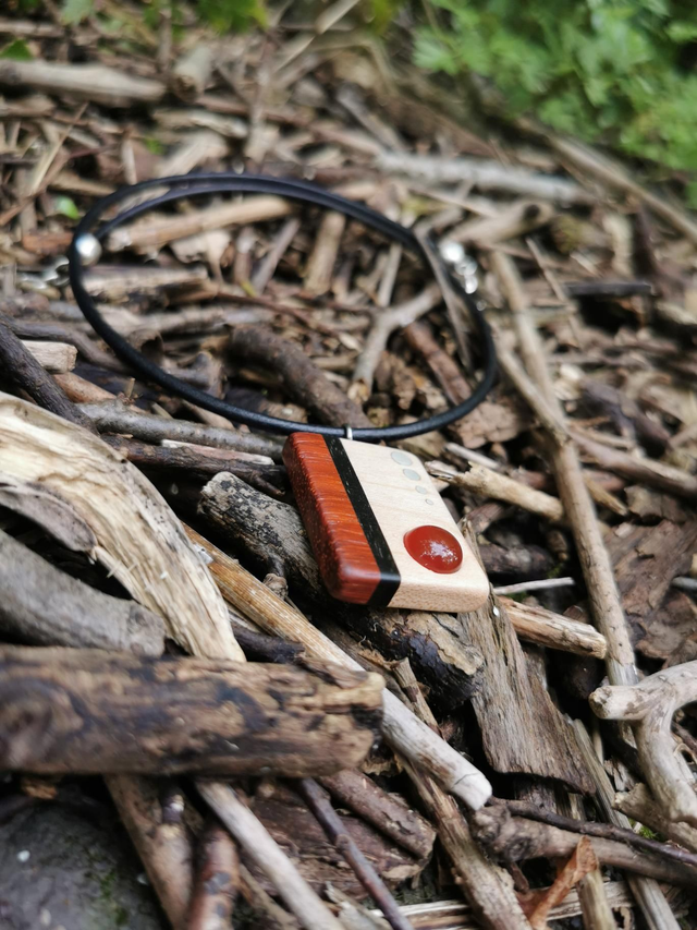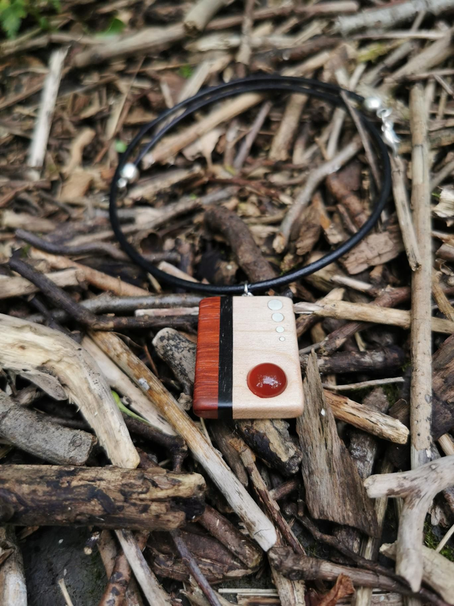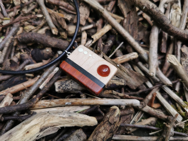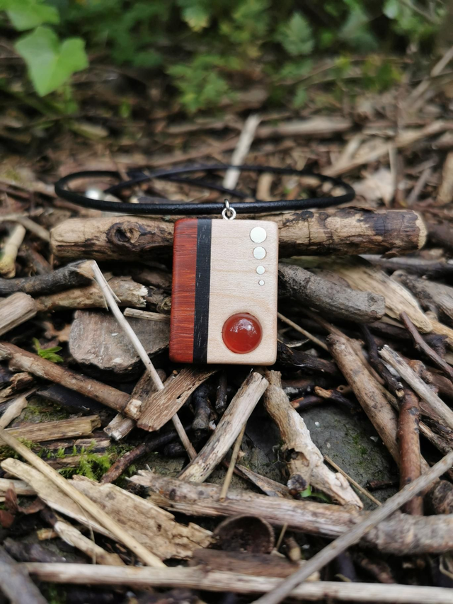 Bois de Padouk, Ébène du Gabon et Sycomore. Pierre Cornaline. Comporte quatre inserts en Argent massif. Cordon de Cuir couleur Rouge. Dimensions : Hauteur 3,7 cm par 2,7 cm de Largeur.