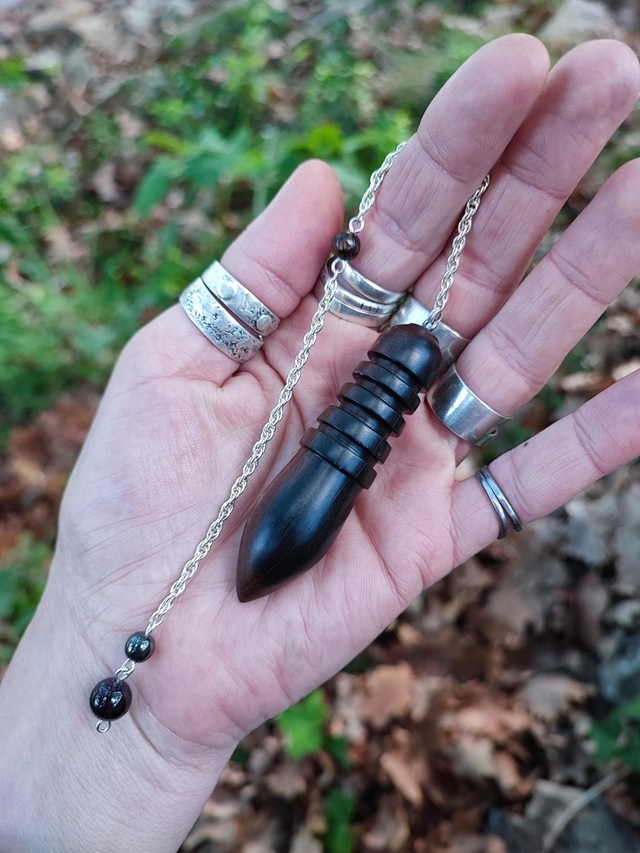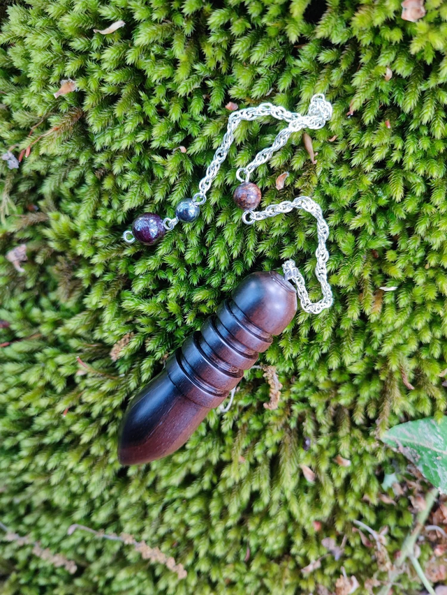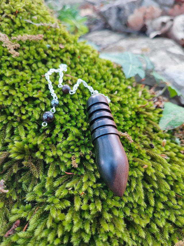 Comporte trois Perles de Pierres, une en Bronzite de 6 mm de diamètre placée sur la chaînette à 8,5 cm au dessus du pendule, une en Hématite de 6 mm et une en Grenat de 8 mm de diamètre, situées toutes les deux à l'extrémité de la chaînette.