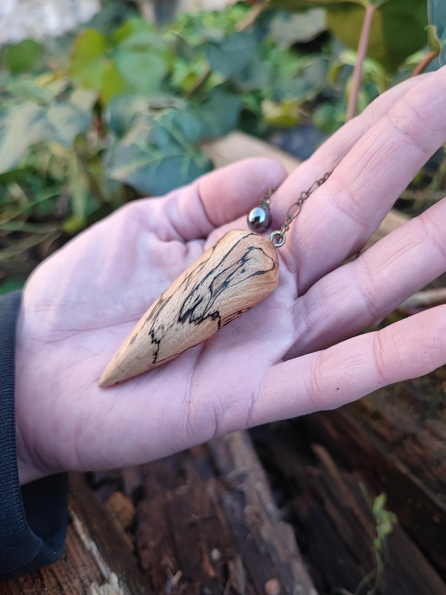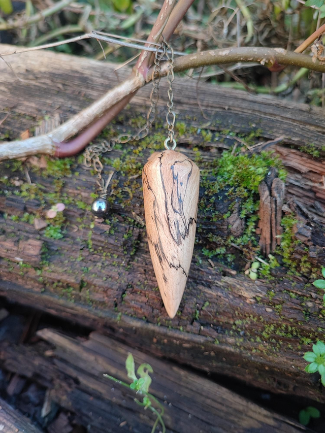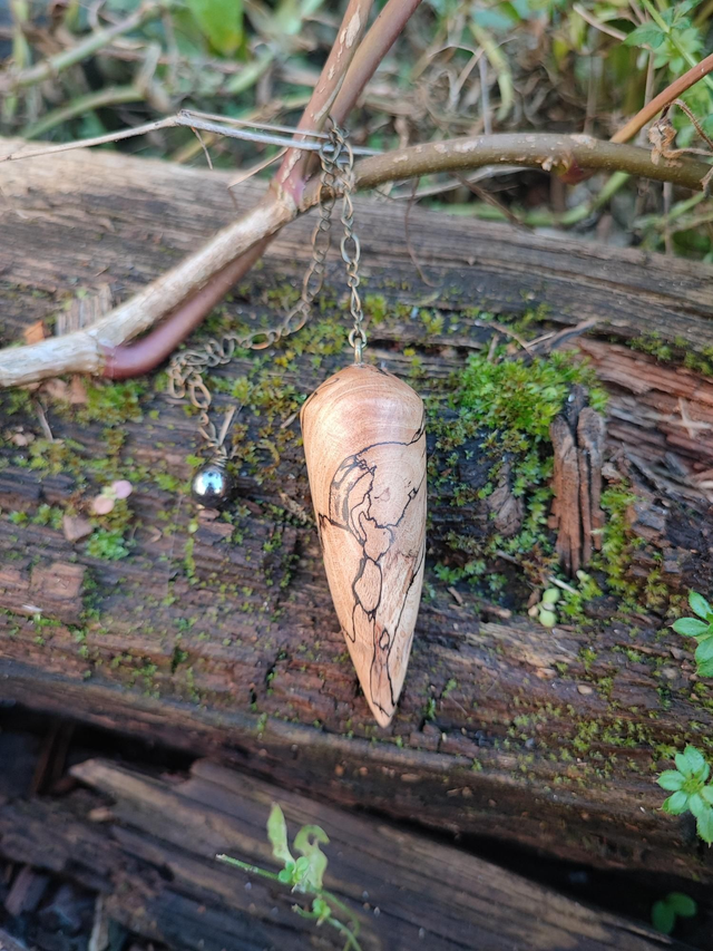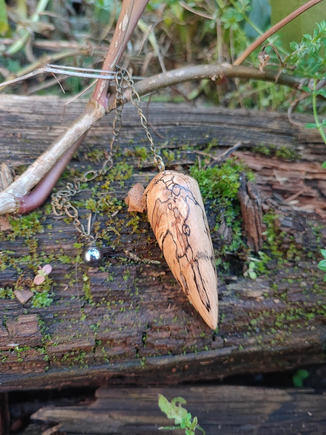 Pendule en Bois de Hêtre Échauffé, Hématite et Chaînette en Laiton vieilli