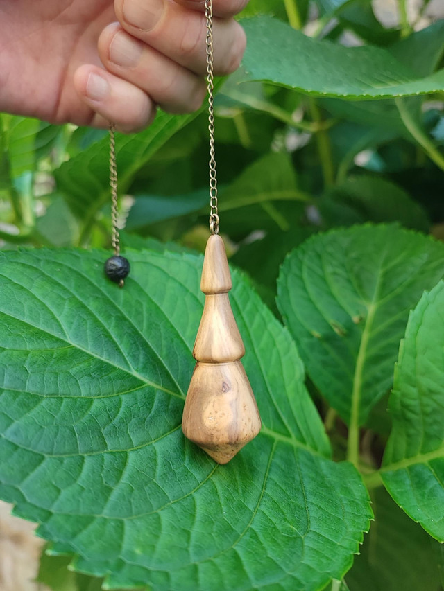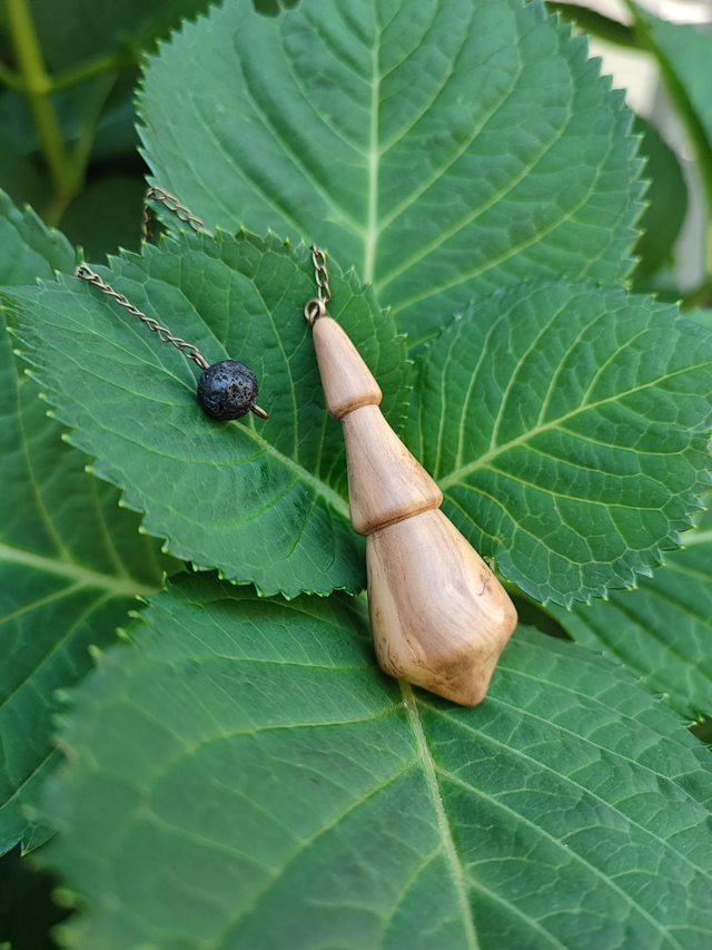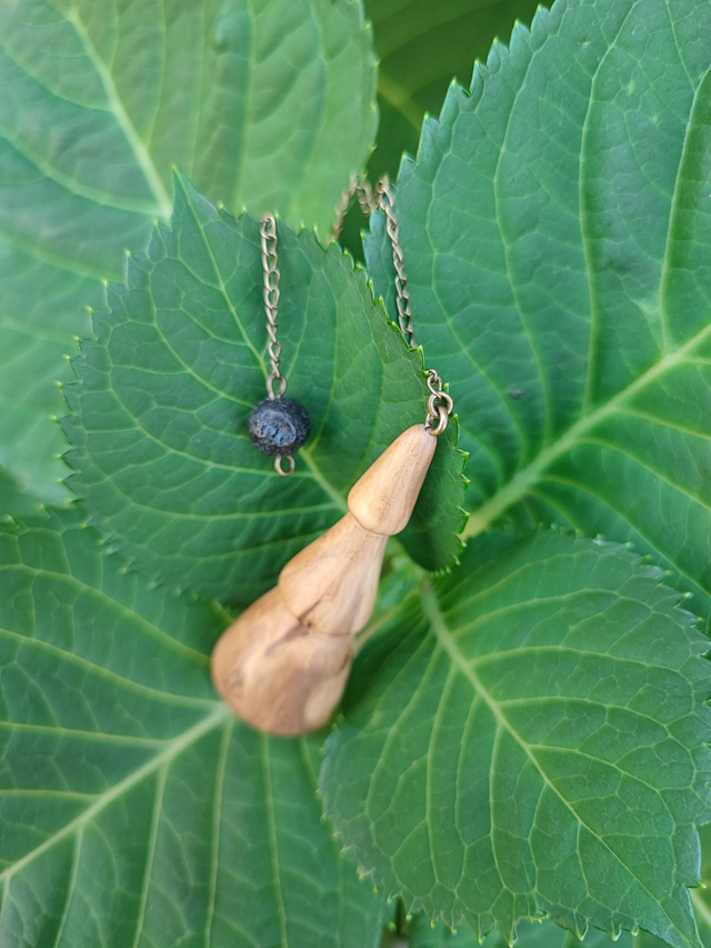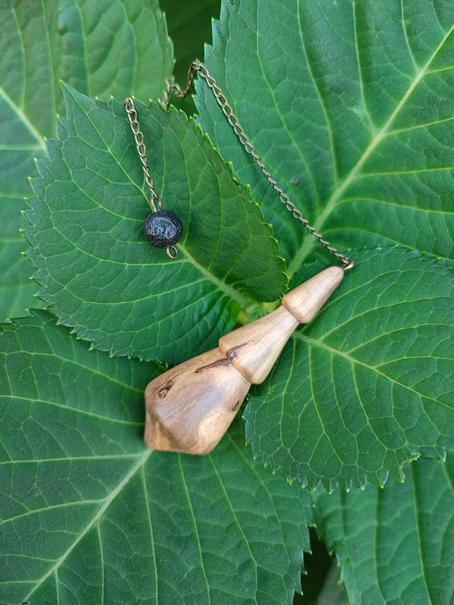 Pendule en Bois de Ronce de Buis Échauffé, Pierre de Lave et Chaînette en Laiton vieilli