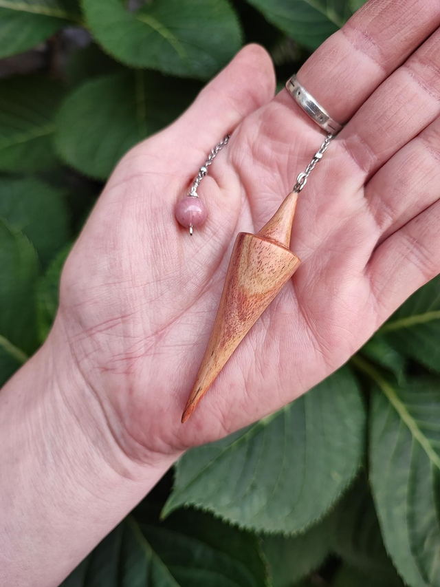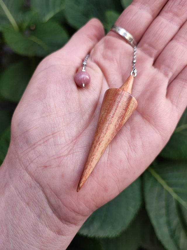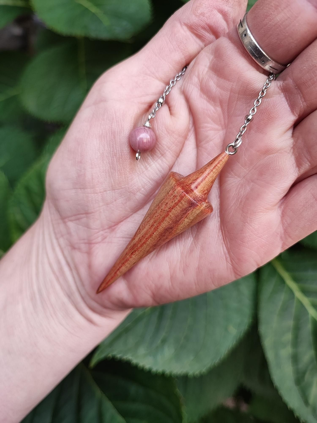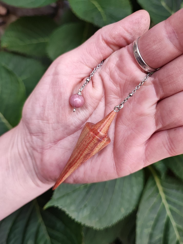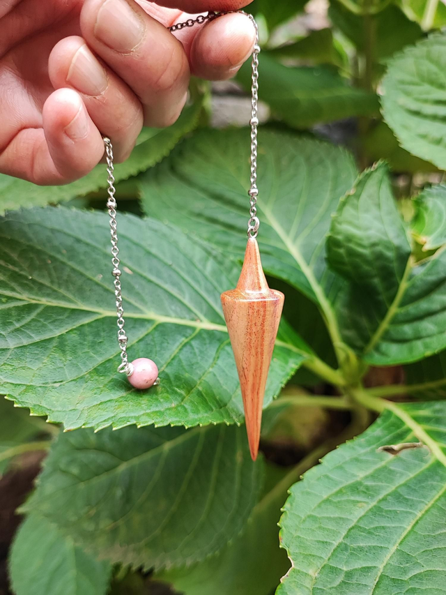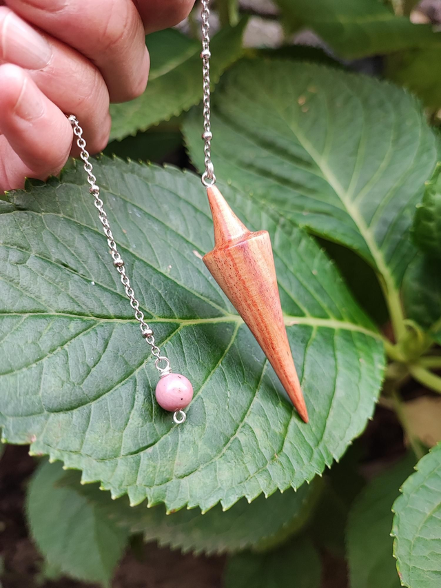 Pendule en Bois de Rose, Perle de Rhodonite et Chaînette en Acier Inoxydable