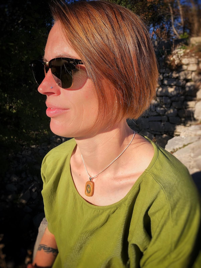 Dimensions pendentif hors bélière : hauteur 3,3 cm par 2,1 cm de largeur, épaisseur 6 mm.
