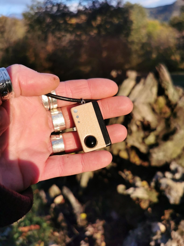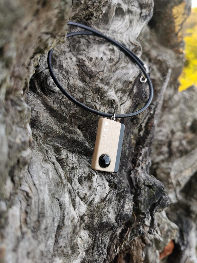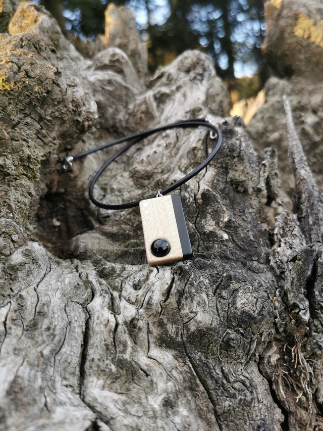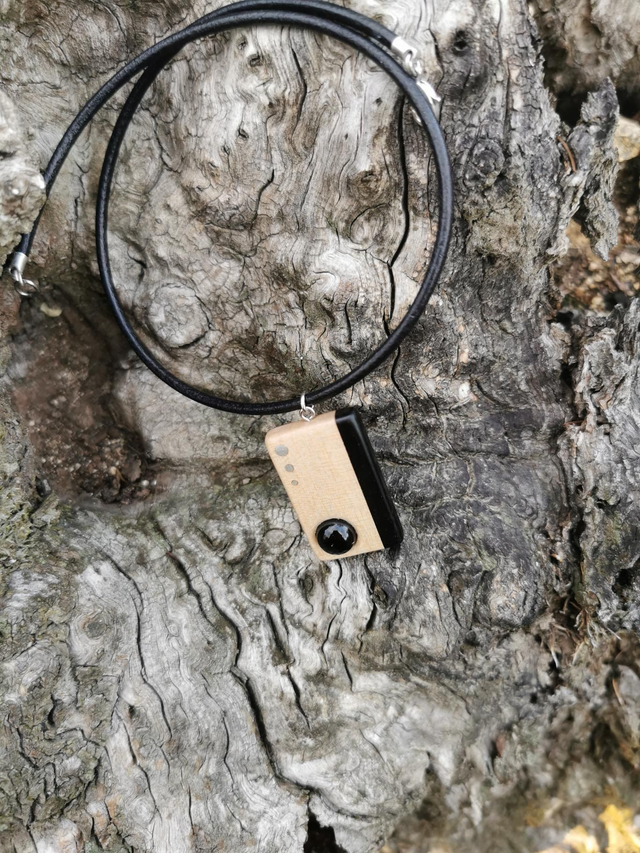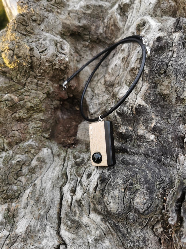Pendentif Rectangle en Bois de Sycomore, Ébène du Gabon, Argent, Obsidienne Noire et Cordon de Cuir
